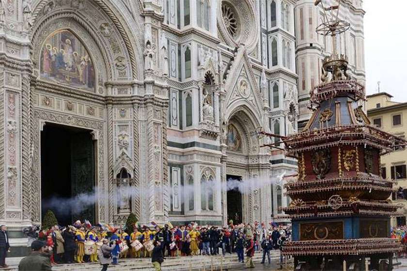 To this day, on Easter Sunday the cart is pulled by two white oxen during a characteristic parade from Porta al Prato to the Duomo, where the commemoration takes place. The cardinal of Florence, after celebrating the mass in the Duomo, lights a fuse on a “colombina”, a rocket shaped like a dove, that crosses the central aisle of the Cathedral heading toward the cart. As the dove hits the cart, it lights the fireworks and sets off a thrilling pyrotechnic show, the “Scoppio del Carro”.